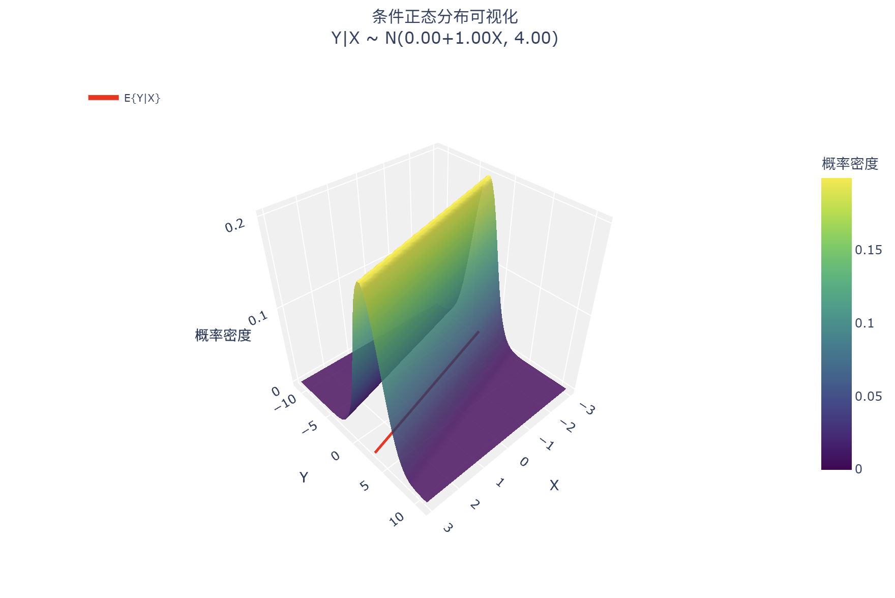 将分布 $ Y|X $ 可视化后,我们可以得到如下图案。由于 $ Y $ 和 $ X $ 之间的关系是线性的,故而联合分布的概率密度3D图呈现出一个沿着回归线移动的钟形图案,而非一个圆形或者椭圆形的曲面。