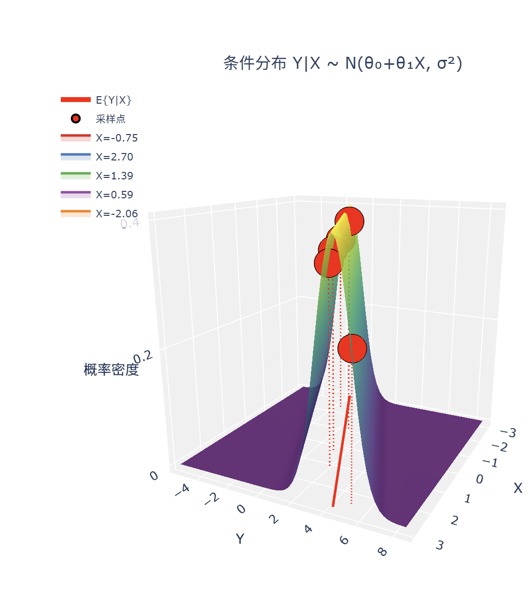 我们可以发现每一个观测点 $ (x_i, y_i) $ 在曲面上都可以对应一个高度,这个高度既是已知观测点时回归线参数对应的似然,也是已知回归线参数和 $ x $ 观测值时,对应 $ y $ 观测值出现的概率。